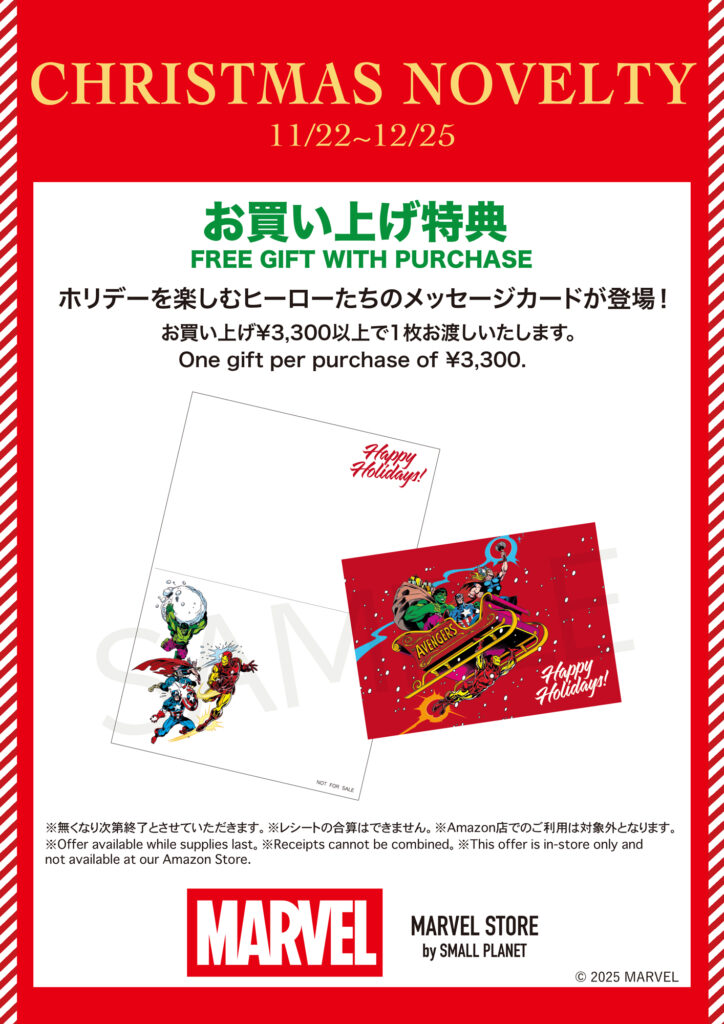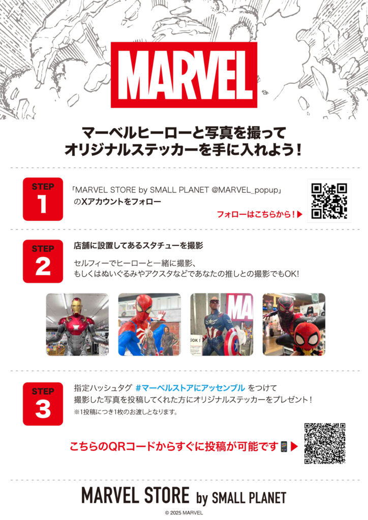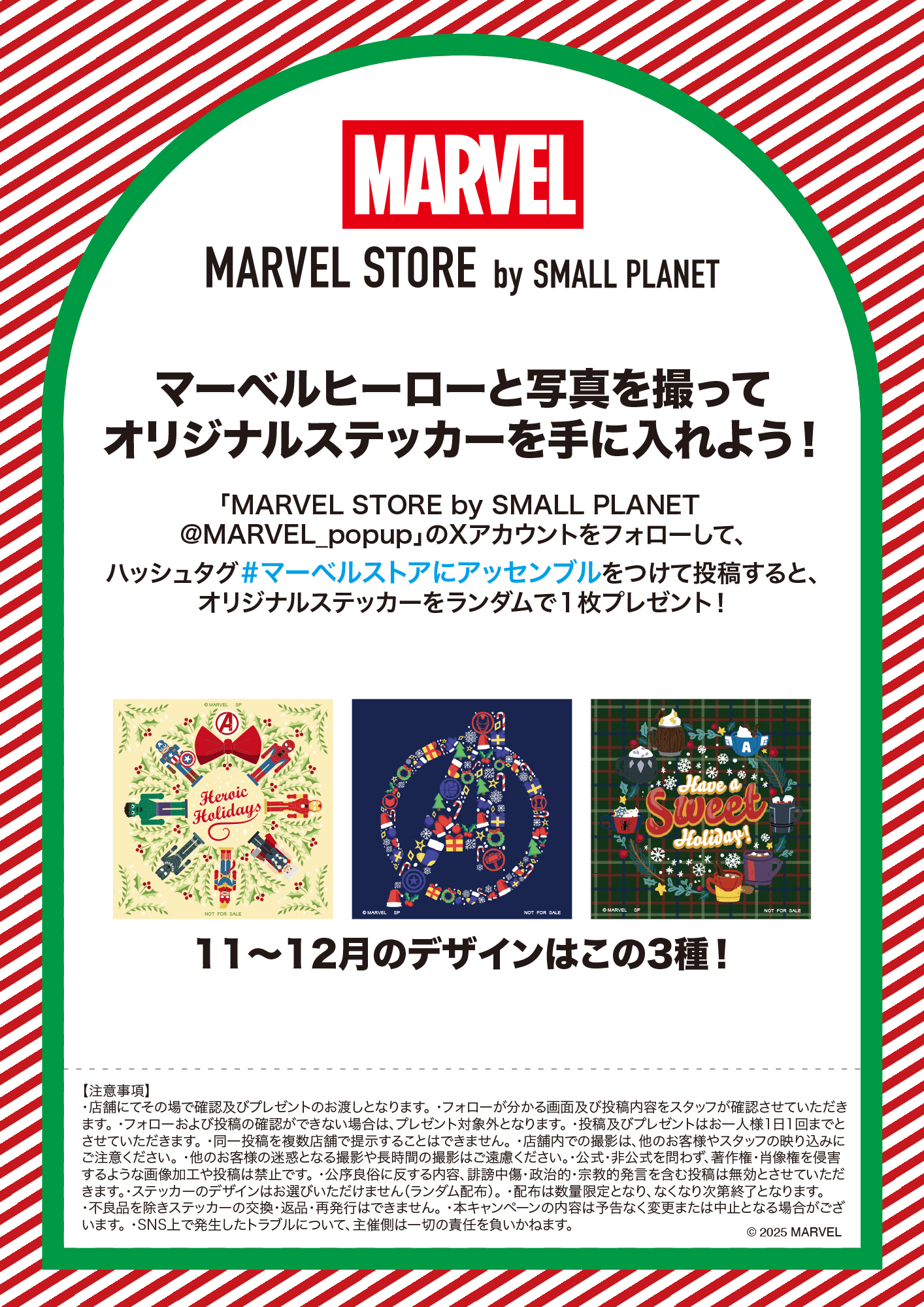 「MARVEL STORE by SMALL PLANET」のXアカウントをフォローして、店頭で撮影した写真にハッシュタグ「#マーベルストアにアッセンブル」をつけて投稿すると、<オリジナルステッカー(全3種)>をランダムで1枚プレゼントいたします!