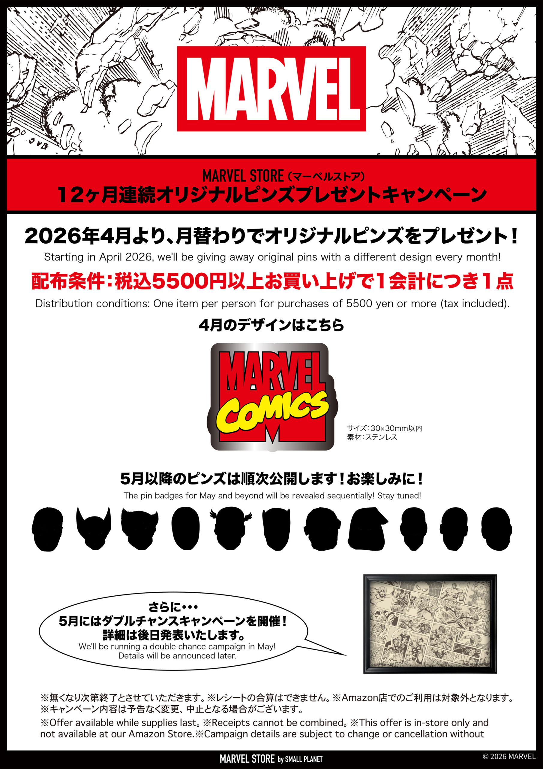 全国のMARVEL STORE(マーベルストア)にて、2026年4月1日(水)より、オリジナルピンズプレゼントキャンペーンを実施いたします。